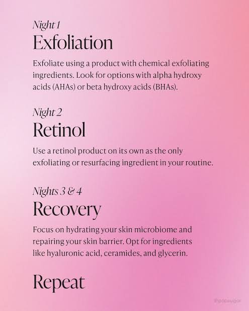 The trend is to improve the efficacy of the active ingredients and minimize irritation through rest periods. Starting with exfoliating on one night followed by retinoid on the second and then resting on the third and fourth. Night two is most beneficial for the skin and helps treat acne to eczema. 3 and 4 are recovery nights that can just be followed up with cleansing and moisturizing. But if you have dry skin, you can just lock moisture with suited products.